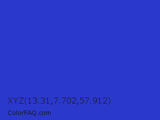 XYZ 13.31,7.702,57.912 Color is a normal blue color and the nearest color is Palatinate Blue #273be2. Hex code #2b38cc and RGB value is rgb(43,56,204). In RGB color space, this color is composed of 17% red, 22% green, 80% blue, In CMYK color space, this color is composed of 79% cyan, 73% magenta, 0% yellow , 20% black , In HSL color space, this color has a hue angle of 235° , 65% saturation and 48% lightness.