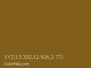 XYZ 13.332,12.926,2.77 Color is a dark orange color and the nearest color is Grizzly #885818. Hex code #815f1a and RGB value is rgb(129,95,26). In RGB color space, this color is composed of 51% red, 37% green, 10% blue, In CMYK color space, this color is composed of 0% cyan, 26% magenta, 80% yellow , 49% black , In HSL color space, this color has a hue angle of 40° , 66% saturation and 30% lightness.