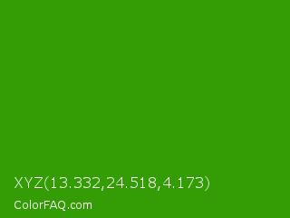 XYZ 13.332,24.518,4.173 Color is a normal green color and the nearest color is Slimy Green #299617. Hex code #349c05 and RGB value is rgb(52,156,5). In RGB color space, this color is composed of 20% red, 61% green, 2% blue, In CMYK color space, this color is composed of 67% cyan, 0% magenta, 97% yellow , 39% black , In HSL color space, this color has a hue angle of 101° , 94% saturation and 32% lightness.