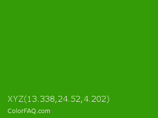 XYZ 13.338,24.52,4.202 Color is a normal green color and the nearest color is Slimy Green #299617. Hex code #349c06 and RGB value is rgb(52,156,6). In RGB color space, this color is composed of 20% red, 61% green, 2% blue, In CMYK color space, this color is composed of 67% cyan, 0% magenta, 96% yellow , 39% black , In HSL color space, this color has a hue angle of 102° , 93% saturation and 32% lightness.