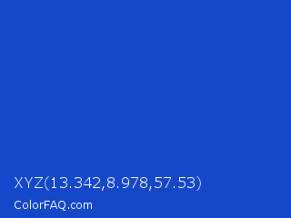 XYZ 13.342,8.978,57.53 Color is a normal blue color and the nearest color is New Car #214fc6. Hex code #1547cb and RGB value is rgb(21,71,203). In RGB color space, this color is composed of 8% red, 28% green, 80% blue, In CMYK color space, this color is composed of 90% cyan, 65% magenta, 0% yellow , 20% black , In HSL color space, this color has a hue angle of 224° , 81% saturation and 44% lightness.