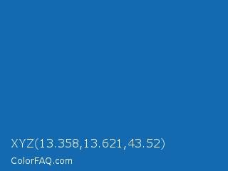 XYZ 13.358,13.621,43.52 Color is a normal blue color and the nearest color is Green Blue #1164b4. Hex code #136ab1 and RGB value is rgb(19,106,177). In RGB color space, this color is composed of 7% red, 42% green, 69% blue, In CMYK color space, this color is composed of 89% cyan, 40% magenta, 0% yellow , 31% black , In HSL color space, this color has a hue angle of 207° , 81% saturation and 38% lightness.
