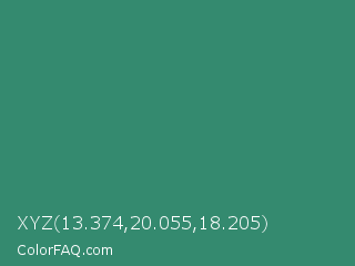 XYZ 13.374,20.055,18.205 Color is a normal green color and the nearest color is Illuminating Emerald #319177. Hex code #348a6f and RGB value is rgb(52,138,111). In RGB color space, this color is composed of 20% red, 54% green, 44% blue, In CMYK color space, this color is composed of 62% cyan, 0% magenta, 20% yellow , 46% black , In HSL color space, this color has a hue angle of 161° , 45% saturation and 37% lightness.