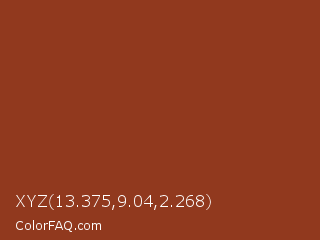 XYZ 13.375,9.04,2.268 Color is a normal red color and the nearest color is Prairie Sand #9a3820. Hex code #91391e and RGB value is rgb(145,57,30). In RGB color space, this color is composed of 57% red, 22% green, 12% blue, In CMYK color space, this color is composed of 0% cyan, 61% magenta, 79% yellow , 43% black , In HSL color space, this color has a hue angle of 14° , 66% saturation and 34% lightness.