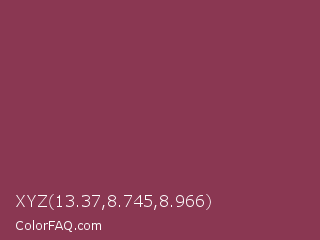 XYZ 13.37,8.745,8.966 Color is a normal rose color and the nearest color is Camelot #893456. Hex code #8a3752 and RGB value is rgb(138,55,82). In RGB color space, this color is composed of 54% red, 22% green, 32% blue, In CMYK color space, this color is composed of 0% cyan, 60% magenta, 41% yellow , 46% black , In HSL color space, this color has a hue angle of 340° , 43% saturation and 38% lightness.