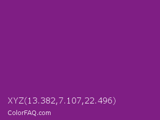 XYZ 13.382,7.107,22.496 Color is a normal magenta color and the nearest color is Seance #731e8f. Hex code #7f1e84 and RGB value is rgb(127,30,132). In RGB color space, this color is composed of 50% red, 12% green, 52% blue, In CMYK color space, this color is composed of 4% cyan, 77% magenta, 0% yellow , 48% black , In HSL color space, this color has a hue angle of 297° , 63% saturation and 32% lightness.