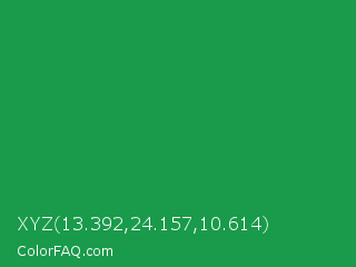 XYZ 13.392,24.157,10.614 Color is a normal green color and the nearest color is Eucalyptus #278a5b. Hex code #199b4b and RGB value is rgb(25,155,75). In RGB color space, this color is composed of 10% red, 61% green, 29% blue, In CMYK color space, this color is composed of 84% cyan, 0% magenta, 52% yellow , 39% black , In HSL color space, this color has a hue angle of 143° , 72% saturation and 35% lightness.