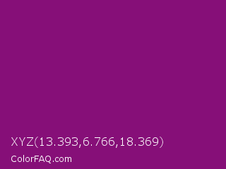 XYZ 13.393,6.766,18.369 Color is a dark magenta color and the nearest color is Patriarch #800080. Hex code #860f78 and RGB value is rgb(134,15,120). In RGB color space, this color is composed of 53% red, 6% green, 47% blue, In CMYK color space, this color is composed of 0% cyan, 89% magenta, 10% yellow , 47% black , In HSL color space, this color has a hue angle of 307° , 80% saturation and 29% lightness.