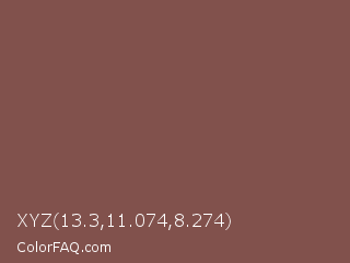XYZ 13.3,11.074,8.274 Color is a normal red color and the nearest color is Tuscan Red #7c4848. Hex code #81514c and RGB value is rgb(129,81,76). In RGB color space, this color is composed of 51% red, 32% green, 30% blue, In CMYK color space, this color is composed of 0% cyan, 37% magenta, 41% yellow , 49% black , In HSL color space, this color has a hue angle of 6° , 26% saturation and 40% lightness.