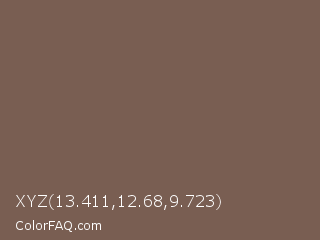 XYZ 13.411,12.68,9.723 Color is a normal orange color and the nearest color is Roman Coffee #795d4c. Hex code #795e52 and RGB value is rgb(121,94,82). In RGB color space, this color is composed of 47% red, 37% green, 32% blue, In CMYK color space, this color is composed of 0% cyan, 22% magenta, 32% yellow , 53% black , In HSL color space, this color has a hue angle of 18° , 19% saturation and 40% lightness.