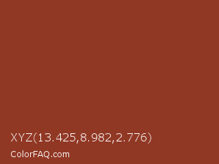 XYZ 13.425,8.982,2.776 Color is a normal red color and the nearest color is Burnt Umber #8a3324. Hex code #913825 and RGB value is rgb(145,56,37). In RGB color space, this color is composed of 57% red, 22% green, 15% blue, In CMYK color space, this color is composed of 0% cyan, 61% magenta, 74% yellow , 43% black , In HSL color space, this color has a hue angle of 11° , 59% saturation and 36% lightness.