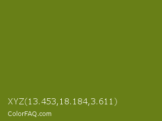XYZ 13.453,18.184,3.611 Color is a dark lime color and the nearest color is Fern Frond #657220. Hex code #687f17 and RGB value is rgb(104,127,23). In RGB color space, this color is composed of 41% red, 50% green, 9% blue, In CMYK color space, this color is composed of 18% cyan, 0% magenta, 82% yellow , 50% black , In HSL color space, this color has a hue angle of 73° , 69% saturation and 29% lightness.