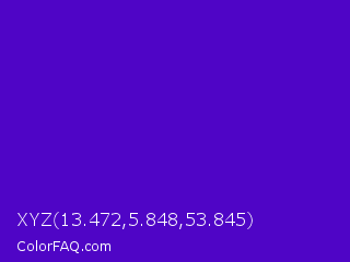 XYZ 13.472,5.848,53.845 Color is a normal violet color and the nearest color is Interdimensional Blue #360ccc. Hex code #4f05c6 and RGB value is rgb(79,5,198). In RGB color space, this color is composed of 31% red, 2% green, 78% blue, In CMYK color space, this color is composed of 60% cyan, 97% magenta, 0% yellow , 22% black , In HSL color space, this color has a hue angle of 263° , 95% saturation and 40% lightness.