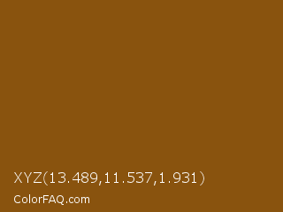 XYZ 13.489,11.537,1.931 Color is a dark orange color and the nearest color is Rusty Nail #86560a. Hex code #89530e and RGB value is rgb(137,83,14). In RGB color space, this color is composed of 54% red, 33% green, 5% blue, In CMYK color space, this color is composed of 0% cyan, 39% magenta, 90% yellow , 46% black , In HSL color space, this color has a hue angle of 34° , 81% saturation and 30% lightness.