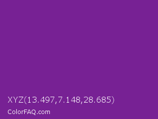 XYZ 13.497,7.148,28.685 Color is a normal purple color and the nearest color is Seance #731e8f. Hex code #772194 and RGB value is rgb(119,33,148). In RGB color space, this color is composed of 47% red, 13% green, 58% blue, In CMYK color space, this color is composed of 20% cyan, 78% magenta, 0% yellow , 42% black , In HSL color space, this color has a hue angle of 285° , 64% saturation and 35% lightness.