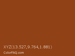 XYZ 13.527,9.764,1.881 Color is a normal orange color and the nearest color is Saddle Brown #8b4513. Hex code #904115 and RGB value is rgb(144,65,21). In RGB color space, this color is composed of 56% red, 25% green, 8% blue, In CMYK color space, this color is composed of 0% cyan, 55% magenta, 85% yellow , 44% black , In HSL color space, this color has a hue angle of 21° , 75% saturation and 32% lightness.