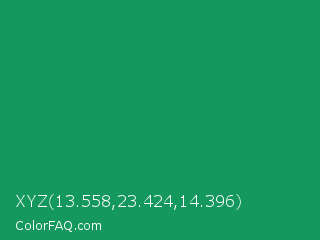 XYZ 13.558,23.424,14.396 Color is a normal green color and the nearest color is Shamrock Green #009e60. Hex code #15985e and RGB value is rgb(21,152,94). In RGB color space, this color is composed of 8% red, 60% green, 37% blue, In CMYK color space, this color is composed of 86% cyan, 0% magenta, 38% yellow , 40% black , In HSL color space, this color has a hue angle of 153° , 76% saturation and 34% lightness.
