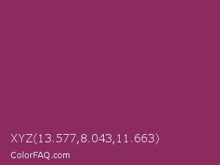 XYZ 13.577,8.043,11.663 Color is a normal rose color and the nearest color is Boysenberry #873260. Hex code #8b2b5f and RGB value is rgb(139,43,95). In RGB color space, this color is composed of 55% red, 17% green, 37% blue, In CMYK color space, this color is composed of 0% cyan, 69% magenta, 32% yellow , 45% black , In HSL color space, this color has a hue angle of 328° , 53% saturation and 36% lightness.
