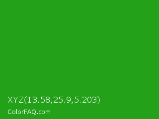 XYZ 13.58,25.9,5.203 Color is a normal green color and the nearest color is Slimy Green #299617. Hex code #22a119 and RGB value is rgb(34,161,25). In RGB color space, this color is composed of 13% red, 63% green, 10% blue, In CMYK color space, this color is composed of 79% cyan, 0% magenta, 84% yellow , 37% black , In HSL color space, this color has a hue angle of 116° , 73% saturation and 36% lightness.