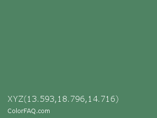 XYZ 13.593,18.796,14.716 Color is a normal green color and the nearest color is Como #517c66. Hex code #4f8363 and RGB value is rgb(79,131,99). In RGB color space, this color is composed of 31% red, 51% green, 39% blue, In CMYK color space, this color is composed of 40% cyan, 0% magenta, 24% yellow , 49% black , In HSL color space, this color has a hue angle of 143° , 25% saturation and 41% lightness.