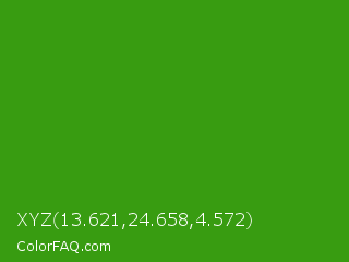 XYZ 13.621,24.658,4.572 Color is a normal green color and the nearest color is Slimy Green #299617. Hex code #389c11 and RGB value is rgb(56,156,17). In RGB color space, this color is composed of 22% red, 61% green, 7% blue, In CMYK color space, this color is composed of 64% cyan, 0% magenta, 89% yellow , 39% black , In HSL color space, this color has a hue angle of 103° , 80% saturation and 34% lightness.