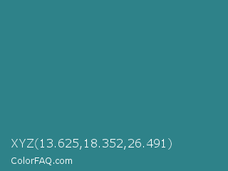 XYZ 13.625,18.352,26.491 Color is a normal cyan color and the nearest color is Paradiso #317d82. Hex code #2e8289 and RGB value is rgb(46,130,137). In RGB color space, this color is composed of 18% red, 51% green, 54% blue, In CMYK color space, this color is composed of 66% cyan, 5% magenta, 0% yellow , 46% black , In HSL color space, this color has a hue angle of 185° , 50% saturation and 36% lightness.