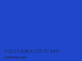 XYZ 13.628,9.125,57.543 Color is a normal blue color and the nearest color is New Car #214fc6. Hex code #2047cb and RGB value is rgb(32,71,203). In RGB color space, this color is composed of 13% red, 28% green, 80% blue, In CMYK color space, this color is composed of 84% cyan, 65% magenta, 0% yellow , 20% black , In HSL color space, this color has a hue angle of 226° , 73% saturation and 46% lightness.