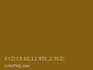 XYZ 13.62,12.951,2.312 Color is a dark orange color and the nearest color is Grizzly #885818. Hex code #845e11 and RGB value is rgb(132,94,17). In RGB color space, this color is composed of 52% red, 37% green, 7% blue, In CMYK color space, this color is composed of 0% cyan, 29% magenta, 87% yellow , 48% black , In HSL color space, this color has a hue angle of 40° , 77% saturation and 29% lightness.