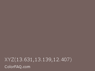 XYZ 13.631,13.139,12.407 Color is a normal red color and the nearest color is Deep Taupe #7e5e60. Hex code #75615e and RGB value is rgb(117,97,94). In RGB color space, this color is composed of 46% red, 38% green, 37% blue, In CMYK color space, this color is composed of 0% cyan, 17% magenta, 20% yellow , 54% black , In HSL color space, this color has a hue angle of 8° , 11% saturation and 41% lightness.