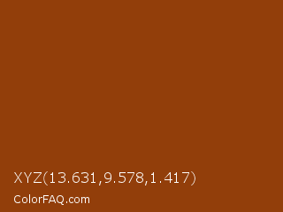 XYZ 13.631,9.578,1.417 Color is a normal orange color and the nearest color is Saddle Brown #8b4513. Hex code #923e0a and RGB value is rgb(146,62,10). In RGB color space, this color is composed of 57% red, 24% green, 4% blue, In CMYK color space, this color is composed of 0% cyan, 58% magenta, 93% yellow , 43% black , In HSL color space, this color has a hue angle of 23° , 87% saturation and 31% lightness.