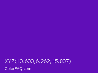 XYZ 13.633,6.262,45.837 Color is a normal violet color and the nearest color is Purple Heart Crayola #652dc1. Hex code #600eb8 and RGB value is rgb(96,14,184). In RGB color space, this color is composed of 38% red, 5% green, 72% blue, In CMYK color space, this color is composed of 48% cyan, 92% magenta, 0% yellow , 28% black , In HSL color space, this color has a hue angle of 269° , 86% saturation and 39% lightness.