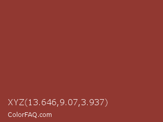 XYZ 13.646,9.07,3.937 Color is a normal red color and the nearest color is El Salva #8f3e33. Hex code #913831 and RGB value is rgb(145,56,49). In RGB color space, this color is composed of 57% red, 22% green, 19% blue, In CMYK color space, this color is composed of 0% cyan, 61% magenta, 66% yellow , 43% black , In HSL color space, this color has a hue angle of 4° , 49% saturation and 38% lightness.