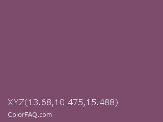 XYZ 13.68,10.475,15.488 Color is a normal magenta color and the nearest color is Twilight Lavender #8a496b. Hex code #7d4b6c and RGB value is rgb(125,75,108). In RGB color space, this color is composed of 49% red, 29% green, 42% blue, In CMYK color space, this color is composed of 0% cyan, 40% magenta, 14% yellow , 51% black , In HSL color space, this color has a hue angle of 320° , 25% saturation and 39% lightness.