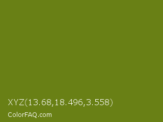 XYZ 13.68,18.496,3.558 Color is a dark lime color and the nearest color is Pacifika #778120. Hex code #698015 and RGB value is rgb(105,128,21). In RGB color space, this color is composed of 41% red, 50% green, 8% blue, In CMYK color space, this color is composed of 18% cyan, 0% magenta, 84% yellow , 50% black , In HSL color space, this color has a hue angle of 73° , 72% saturation and 29% lightness.