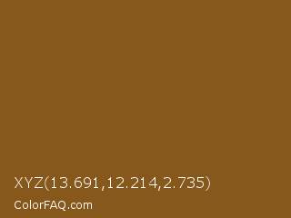 XYZ 13.691,12.214,2.735 Color is a normal orange color and the nearest color is Grizzly #885818. Hex code #87581c and RGB value is rgb(135,88,28). In RGB color space, this color is composed of 53% red, 35% green, 11% blue, In CMYK color space, this color is composed of 0% cyan, 35% magenta, 79% yellow , 47% black , In HSL color space, this color has a hue angle of 34° , 66% saturation and 32% lightness.