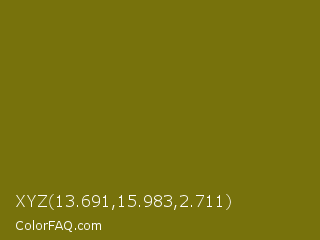 XYZ 13.691,15.983,2.711 Color is a dark yellow color and the nearest color is Olivetone #716e10. Hex code #77720c and RGB value is rgb(119,114,12). In RGB color space, this color is composed of 47% red, 45% green, 5% blue, In CMYK color space, this color is composed of 0% cyan, 4% magenta, 90% yellow , 53% black , In HSL color space, this color has a hue angle of 57° , 82% saturation and 26% lightness.
