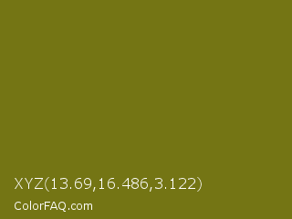 XYZ 13.69,16.486,3.122 Color is a dark yellow color and the nearest color is Olivetone #716e10. Hex code #747514 and RGB value is rgb(116,117,20). In RGB color space, this color is composed of 45% red, 46% green, 8% blue, In CMYK color space, this color is composed of 1% cyan, 0% magenta, 83% yellow , 54% black , In HSL color space, this color has a hue angle of 61° , 71% saturation and 27% lightness.