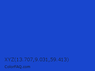 XYZ 13.707,9.031,59.413 Color is a normal blue color and the nearest color is New Car #214fc6. Hex code #1846ce and RGB value is rgb(24,70,206). In RGB color space, this color is composed of 9% red, 27% green, 81% blue, In CMYK color space, this color is composed of 88% cyan, 66% magenta, 0% yellow , 19% black , In HSL color space, this color has a hue angle of 225° , 79% saturation and 45% lightness.