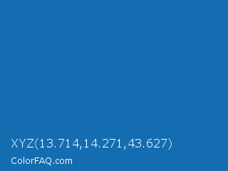 XYZ 13.714,14.271,43.627 Color is a normal blue color and the nearest color is Green Blue #1164b4. Hex code #156db1 and RGB value is rgb(21,109,177). In RGB color space, this color is composed of 8% red, 43% green, 69% blue, In CMYK color space, this color is composed of 88% cyan, 38% magenta, 0% yellow , 31% black , In HSL color space, this color has a hue angle of 206° , 79% saturation and 39% lightness.