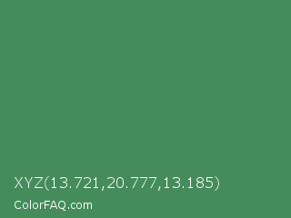 XYZ 13.721,20.777,13.185 Color is a normal green color and the nearest color is Middle Green #4d8c57. Hex code #458c5b and RGB value is rgb(69,140,91). In RGB color space, this color is composed of 27% red, 55% green, 36% blue, In CMYK color space, this color is composed of 51% cyan, 0% magenta, 35% yellow , 45% black , In HSL color space, this color has a hue angle of 139° , 34% saturation and 41% lightness.
