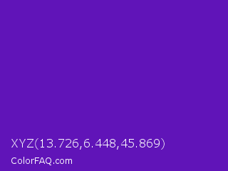 XYZ 13.726,6.448,45.869 Color is a normal violet color and the nearest color is Purple Heart Crayola #652dc1. Hex code #6014b8 and RGB value is rgb(96,20,184). In RGB color space, this color is composed of 38% red, 8% green, 72% blue, In CMYK color space, this color is composed of 48% cyan, 89% magenta, 0% yellow , 28% black , In HSL color space, this color has a hue angle of 268° , 80% saturation and 40% lightness.