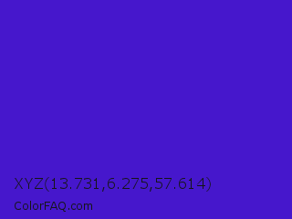 XYZ 13.731,6.275,57.614 Color is a normal indigo color and the nearest color is Interdimensional Blue #360ccc. Hex code #4617cc and RGB value is rgb(70,23,204). In RGB color space, this color is composed of 27% red, 9% green, 80% blue, In CMYK color space, this color is composed of 66% cyan, 89% magenta, 0% yellow , 20% black , In HSL color space, this color has a hue angle of 256° , 80% saturation and 45% lightness.