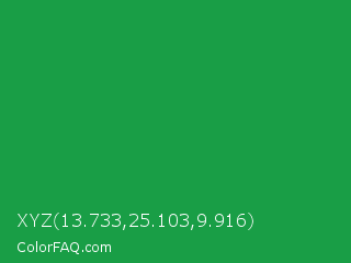XYZ 13.733,25.103,9.916 Color is a normal green color and the nearest color is Green Pigment #00a550. Hex code #199e46 and RGB value is rgb(25,158,70). In RGB color space, this color is composed of 10% red, 62% green, 27% blue, In CMYK color space, this color is composed of 84% cyan, 0% magenta, 56% yellow , 38% black , In HSL color space, this color has a hue angle of 140° , 73% saturation and 36% lightness.