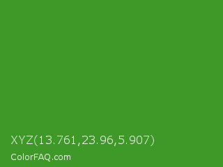 XYZ 13.761,23.96,5.907 Color is a normal green color and the nearest color is La Palma #368716. Hex code #3e9928 and RGB value is rgb(62,153,40). In RGB color space, this color is composed of 24% red, 60% green, 16% blue, In CMYK color space, this color is composed of 59% cyan, 0% magenta, 74% yellow , 40% black , In HSL color space, this color has a hue angle of 108° , 59% saturation and 38% lightness.