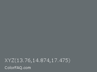 XYZ 13.76,14.874,17.475 Color is a normal blue color and the nearest color is Nevada #646e75. Hex code #656d70 and RGB value is rgb(101,109,112). In RGB color space, this color is composed of 40% red, 43% green, 44% blue, In CMYK color space, this color is composed of 10% cyan, 3% magenta, 0% yellow , 56% black , In HSL color space, this color has a hue angle of 196° , 5% saturation and 42% lightness.