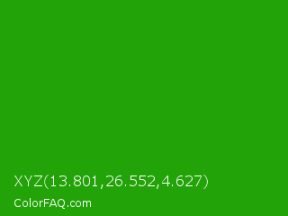 XYZ 13.801,26.552,4.627 Color is a normal green color and the nearest color is Slimy Green #299617. Hex code #22a308 and RGB value is rgb(34,163,8). In RGB color space, this color is composed of 13% red, 64% green, 3% blue, In CMYK color space, this color is composed of 79% cyan, 0% magenta, 95% yellow , 36% black , In HSL color space, this color has a hue angle of 110° , 91% saturation and 34% lightness.