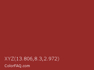 XYZ 13.806,8.3,2.972 Color is a normal red color and the nearest color is Vivid Auburn #922724. Hex code #962a29 and RGB value is rgb(150,42,41). In RGB color space, this color is composed of 59% red, 16% green, 16% blue, In CMYK color space, this color is composed of 0% cyan, 72% magenta, 73% yellow , 41% black , In HSL color space, this color has a hue angle of 1° , 57% saturation and 37% lightness.