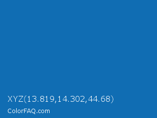 XYZ 13.819,14.302,44.68 Color is a normal blue color and the nearest color is Green Blue #1164b4. Hex code #106db3 and RGB value is rgb(16,109,179). In RGB color space, this color is composed of 6% red, 43% green, 70% blue, In CMYK color space, this color is composed of 91% cyan, 39% magenta, 0% yellow , 30% black , In HSL color space, this color has a hue angle of 206° , 84% saturation and 38% lightness.