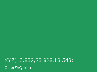 XYZ 13.832,23.828,13.543 Color is a normal green color and the nearest color is Eucalyptus #278a5b. Hex code #20995a and RGB value is rgb(32,153,90). In RGB color space, this color is composed of 13% red, 60% green, 35% blue, In CMYK color space, this color is composed of 79% cyan, 0% magenta, 41% yellow , 40% black , In HSL color space, this color has a hue angle of 149° , 65% saturation and 36% lightness.