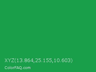 XYZ 13.864,25.155,10.603 Color is a normal green color and the nearest color is Green Pigment #00a550. Hex code #199e4a and RGB value is rgb(25,158,74). In RGB color space, this color is composed of 10% red, 62% green, 29% blue, In CMYK color space, this color is composed of 84% cyan, 0% magenta, 53% yellow , 38% black , In HSL color space, this color has a hue angle of 142° , 73% saturation and 36% lightness.
